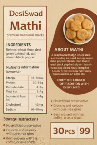 Mathi (or Mathri) is a traditional North Indian namkeen snack, known for its flaky, crispy texture and mildly salty taste. Perfectly seasoned with ajwain (carom seeds) and fried till golden, this snack is an evergreen favorite during tea-time, festivals, and gifting occasions.