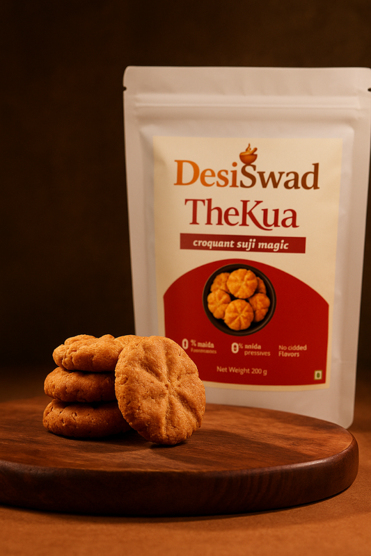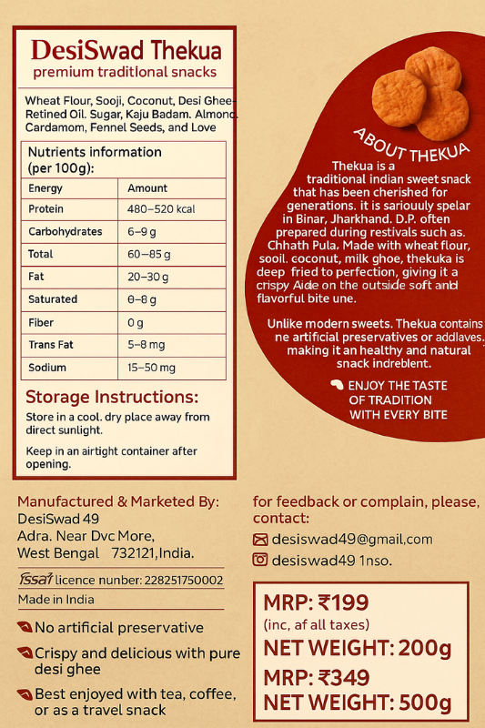 Made using whole wheat flour, jaggery (or sugar), coconut, and desi ghee, Thekua is deep-fried till golden and crisp. It does not contain any preservatives, making it a healthy and authentic Indian snack.